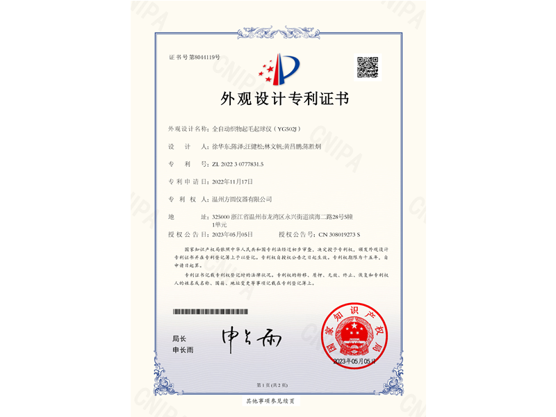 中國外觀設計專利:全自動織物起毛起球儀(ZL 2022 3 0777831.5)