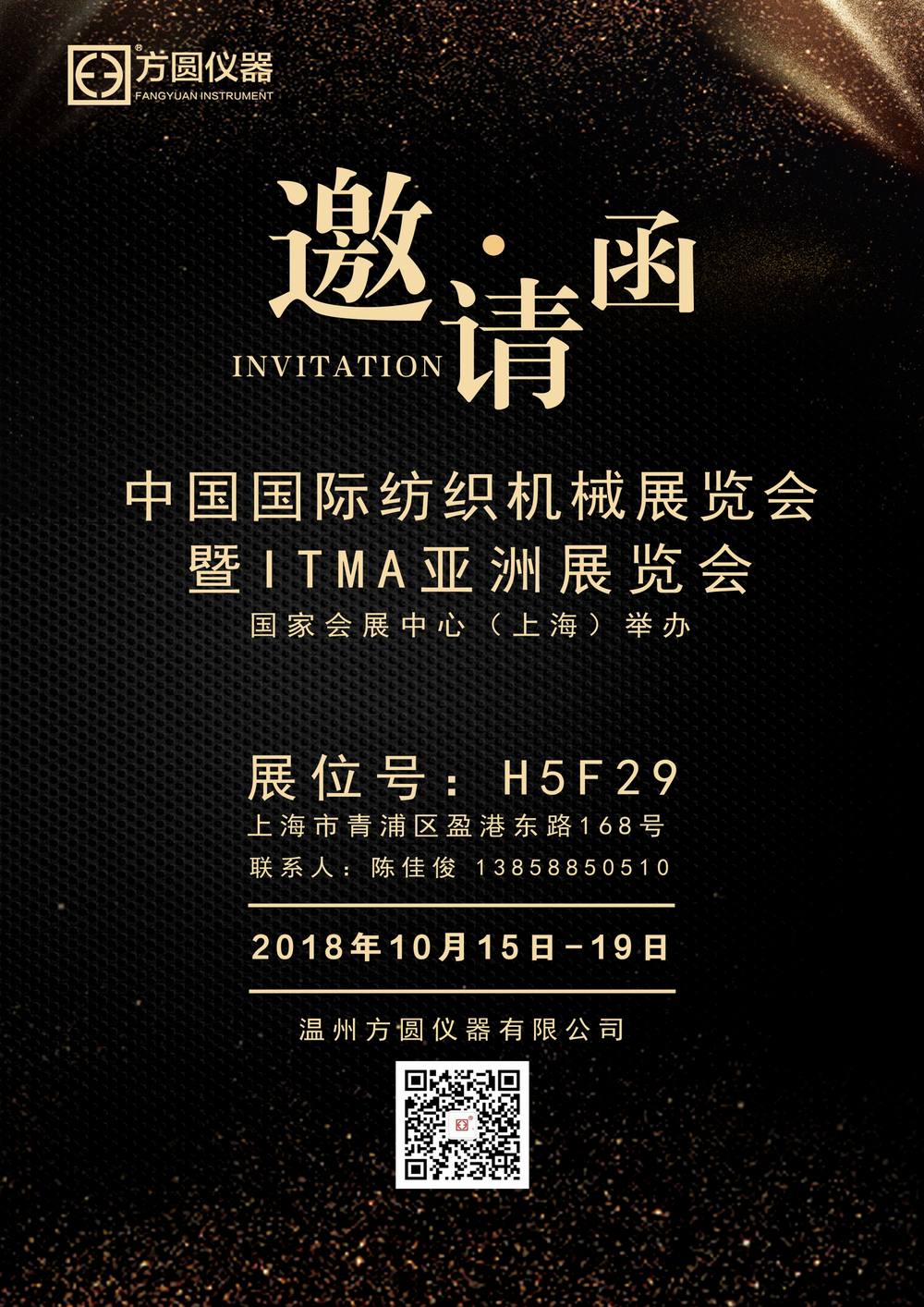 2018年中國國際紡織機械展覽會暨ITMA亞洲展覽會將于2018年10月15日-19日在國家會展中心(上海)舉辦,熱忱歡迎各位紡織人士蒞臨指導(dǎo),共話紡織未來。展位號:H5F29; 地址:上海市青浦區(qū)盈港東路168號;聯(lián)系人:陳佳?。?3858850510)