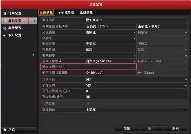 1)這邊的碼率上限指的是設(shè)備的主碼流碼率上限,因?yàn)殇浵褚话闶前凑罩鞔a流來進(jìn)行錄像的;