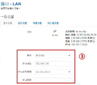 3.修改網(wǎng)橋的管理IP地址:網(wǎng)絡(luò),接口,點(diǎn)擊修改,基本配置里可以進(jìn)行操作,點(diǎn)擊“保存&應(yīng)用”;