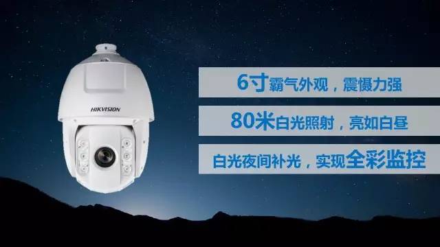 海康威視6寸白光球機,自帶80米超遠白光照射。白光開啟后,周圍環(huán)境亮如白晝,震懾力強。不僅可以照明,也可有效起到警示和威懾作用。